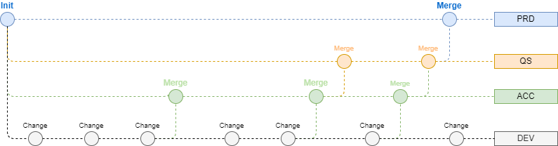 CLOE models for different environments are saved in separate git branches, one branch per environment. In general, changes should only be made to the DEV branch. Changes can then be propagated to other environments by merging the priors environment branch into the branch of the next environment. Environment branches are long-lived and should not be deleted on merge (e.g.DEV/ACC/QS/PRD).