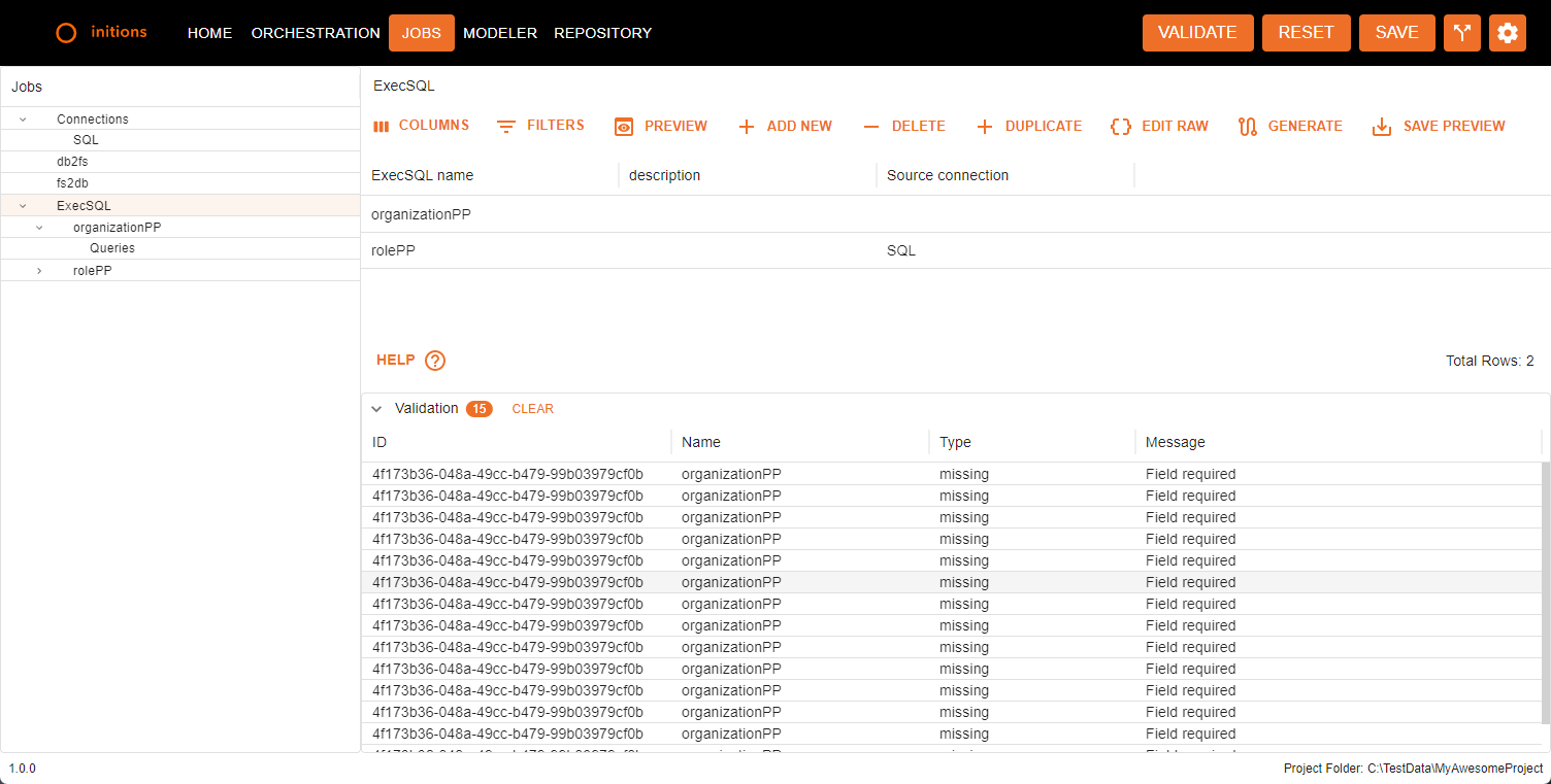 The validate function can be used by clicking on validate in the function menu ribbon. Validate will save the model on disk and validate the full model by sending it to the CLOE API. It will then either show validation errors in the Validation panel or show a flag in the bottom left corner that reads validation passed.