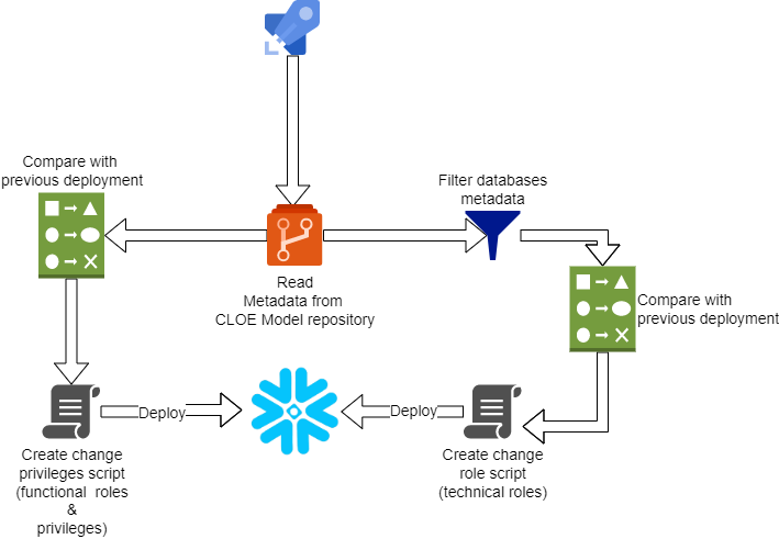 The Snowflake access control package can deploy technical roles and functional roles based on metadata. It can manage privileges of functional roles by using metadata describing the desired state, CLOE will automatically calculate the difference to the latest deployment and make necessary changes to Snowflake.